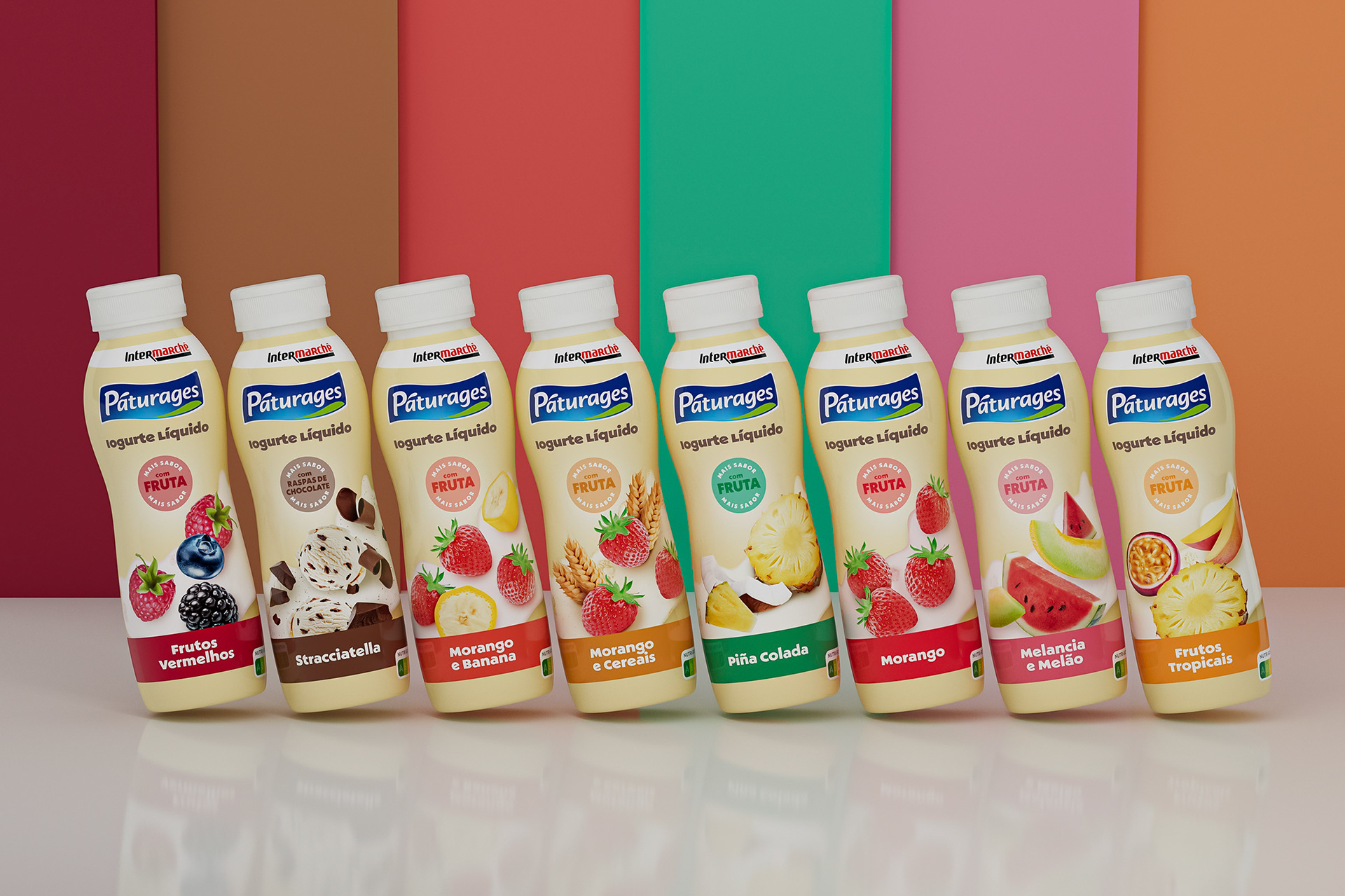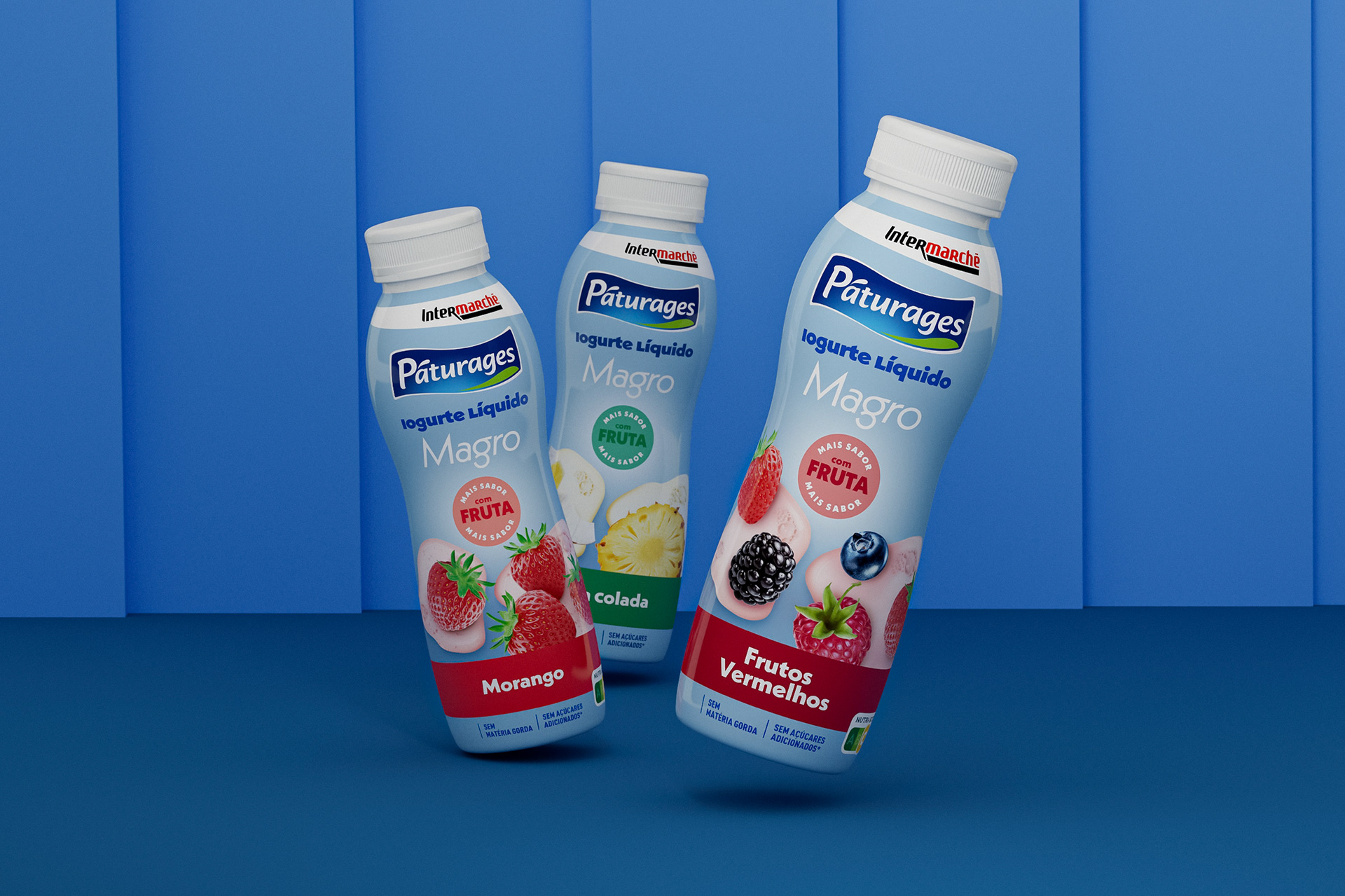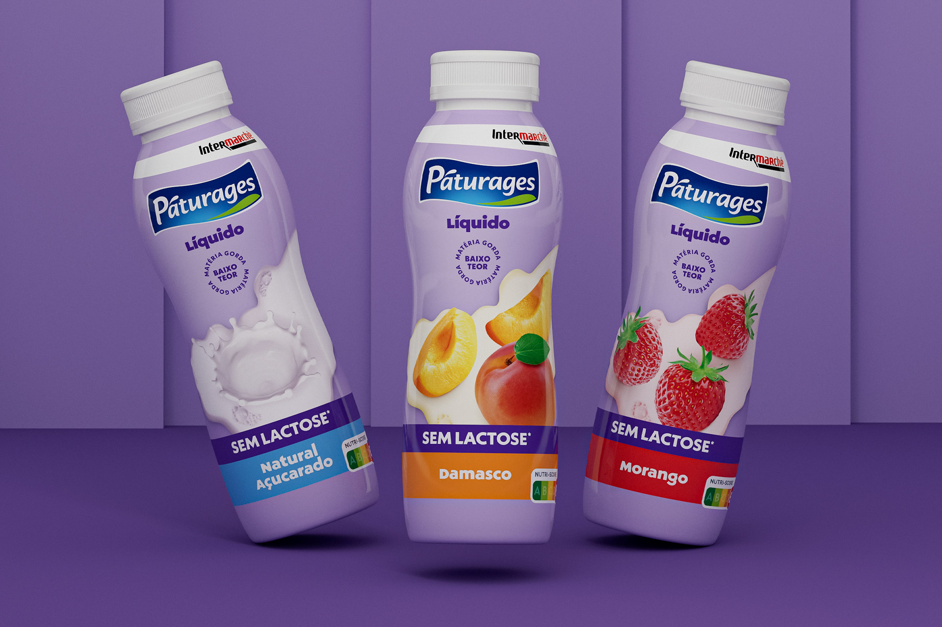 [EN] The new visual identity of Páturages liquid yogurts presents a modern, coherent, and distinctive look, enabling immediate recognition of the three lines that make up the range: Fruit Polme, Magro, and Lactose-Free. The chromatic strategy is the main element of differentiation on the shelf, with cream tones conveying creaminess and naturalness in the Fruit Polme line, blue communicating lightness and nutritional balance in the Magro line, and purple adding personality, modernity, and strong visibility to the Lactose-Free line. Across all variants, the fruit photography is central, realistic, and appealing, reinforcing the perception of flavor and quality. The typography is clean and well-structured, facilitating the identification of benefits and ensuring clarity in communication. The combination of distinct color palettes, balanced composition, and visual consistency makes the range easily recognizable, ensuring strong shelf impact and strengthening the brand’s positioning as a contemporary and carefully designed choice.