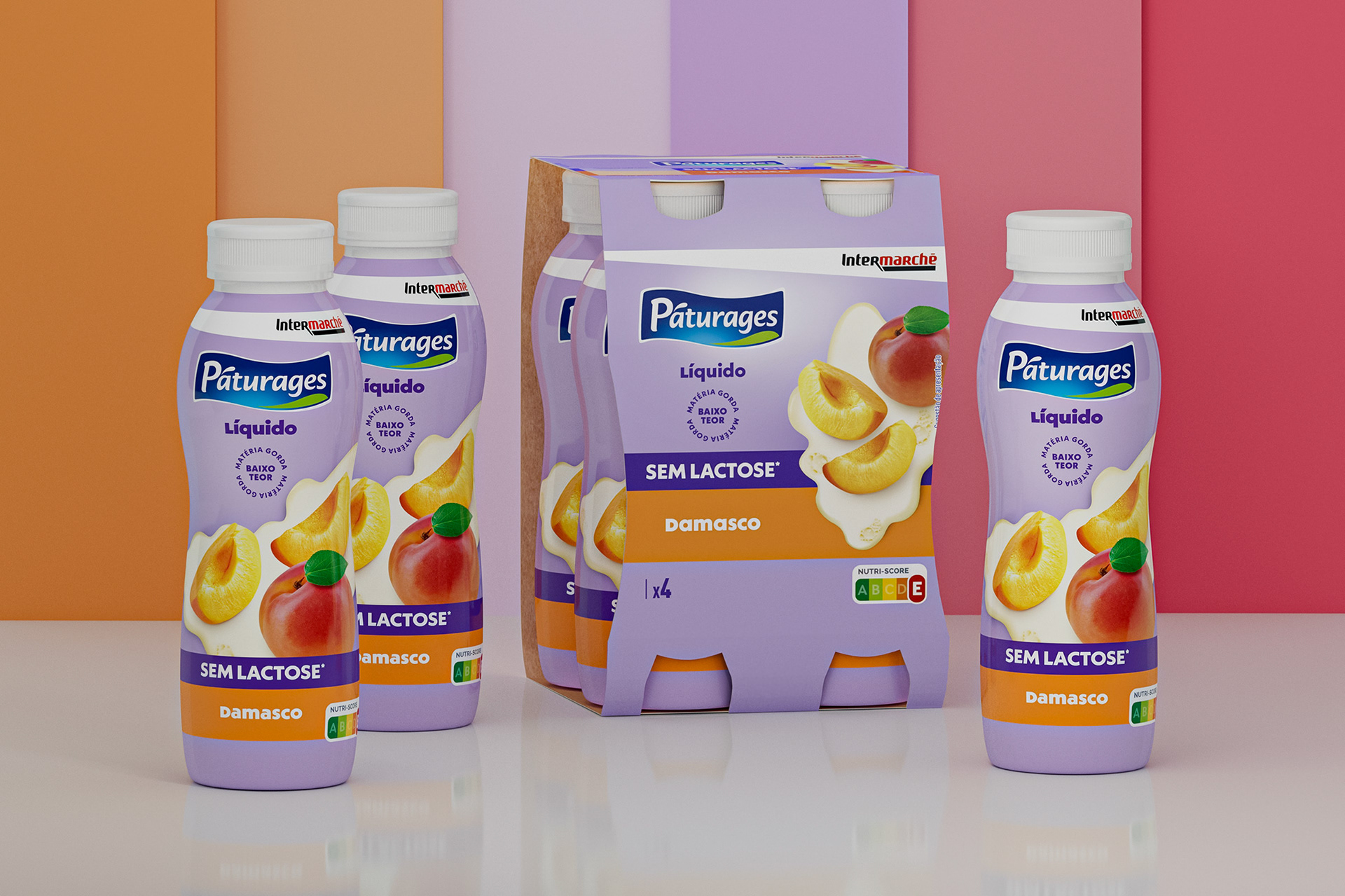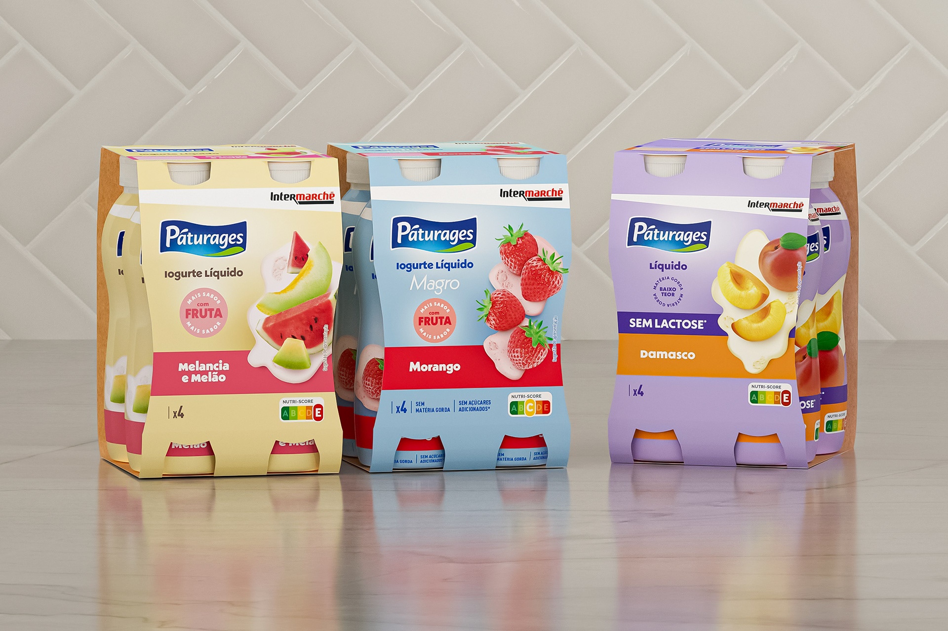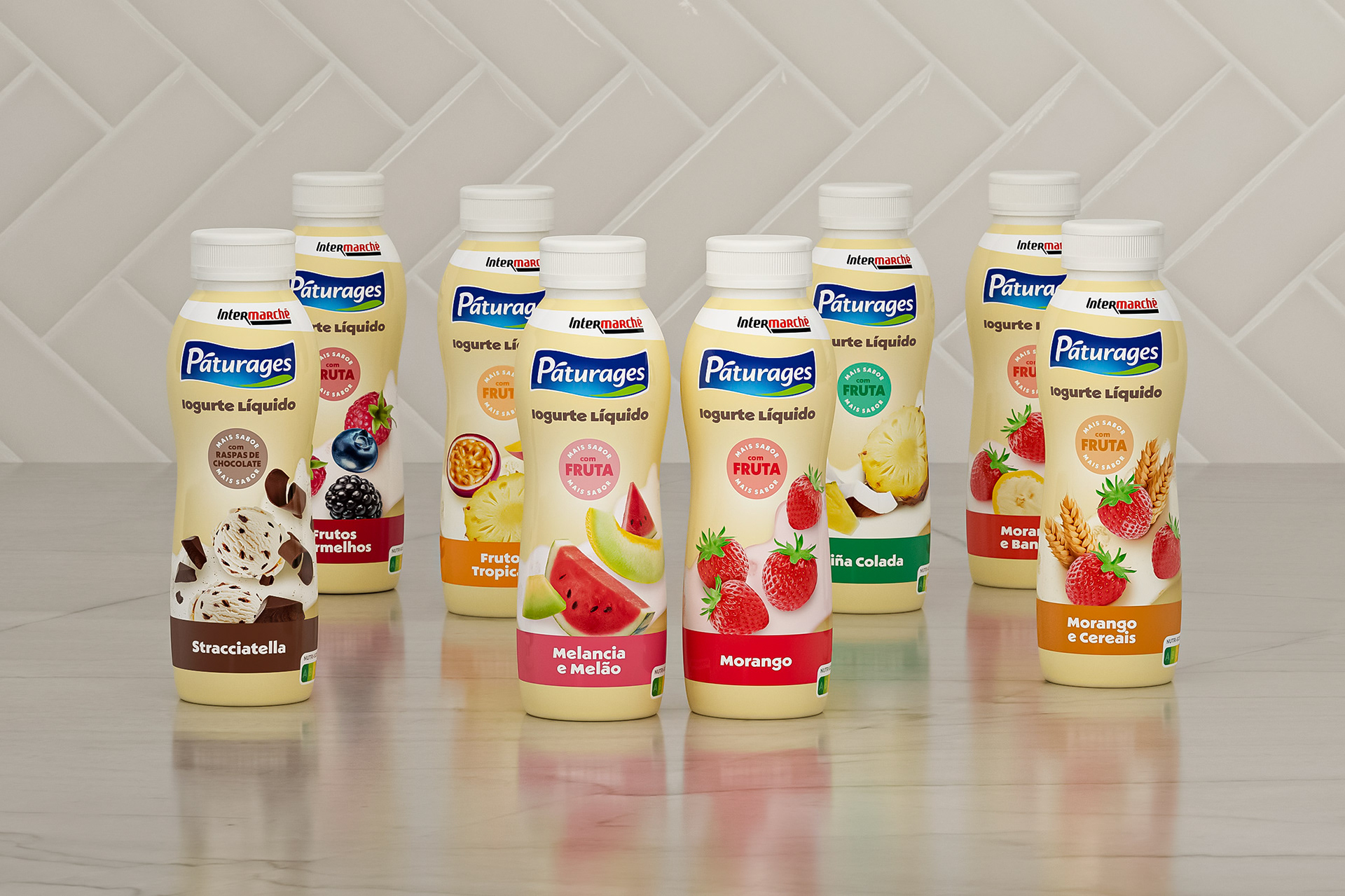 [EN] The new visual identity of Páturages liquid yogurts presents a modern, coherent, and distinctive look, enabling immediate recognition of the three lines that make up the range: Fruit Polme, Magro, and Lactose-Free. The chromatic strategy is the main element of differentiation on the shelf, with cream tones conveying creaminess and naturalness in the Fruit Polme line, blue communicating lightness and nutritional balance in the Magro line, and purple adding personality, modernity, and strong visibility to the Lactose-Free line. Across all variants, the fruit photography is central, realistic, and appealing, reinforcing the perception of flavor and quality. The typography is clean and well-structured, facilitating the identification of benefits and ensuring clarity in communication. The combination of distinct color palettes, balanced composition, and visual consistency makes the range easily recognizable, ensuring strong shelf impact and strengthening the brand’s positioning as a contemporary and carefully designed choice.